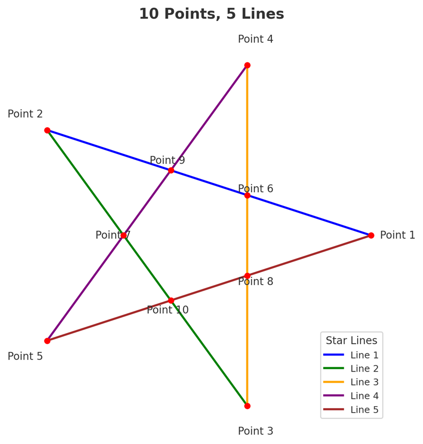 Place 10 points in such a way that you can draw exactly 5 lines, where each line has to go through exactly 4 points.