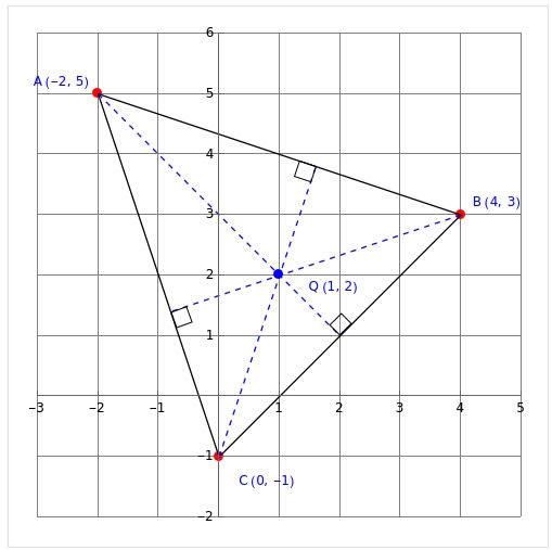 You are given a triangle ABC with vertices A (-2, 5) and B (4, 3), and orthocenter Q (1, 2).