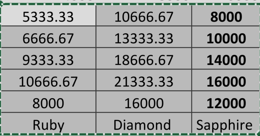 (Ruby, Diamond, Sapphire) = (16000/3, 32000/3, 8000), (20000/3, 40000/3, 10000),