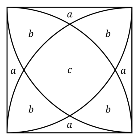 Take a square of side length 1 unit and draw four quarter circles within the square, each with