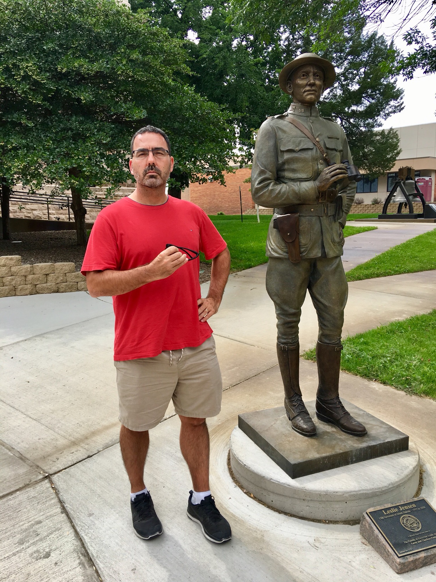 Larry by a statue
